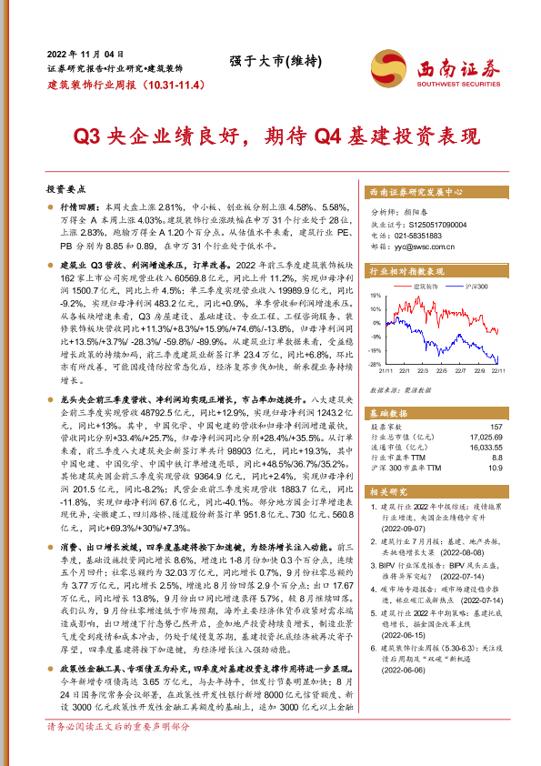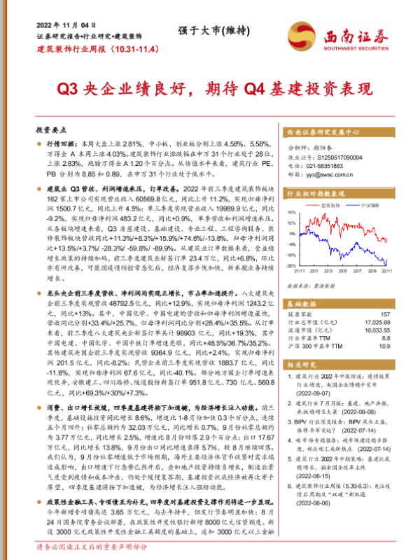 【西南证券】【20221104】20221104-西南证券-建筑装饰行业周报:Q3央企业绩良好,期待Q4基建投资表现-15页