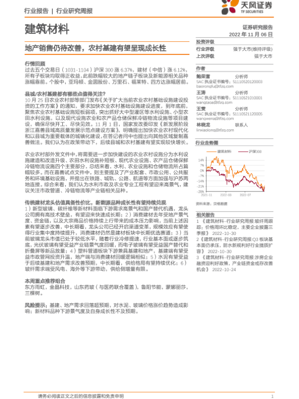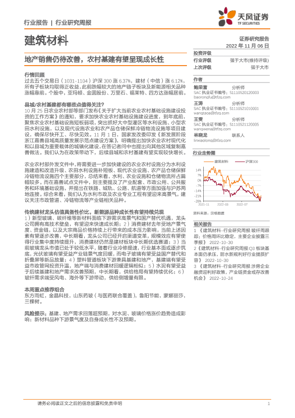 【天风证券】【20221106】建筑材料行业:地产销售仍待改善,农村基建有望呈现成长性-7页