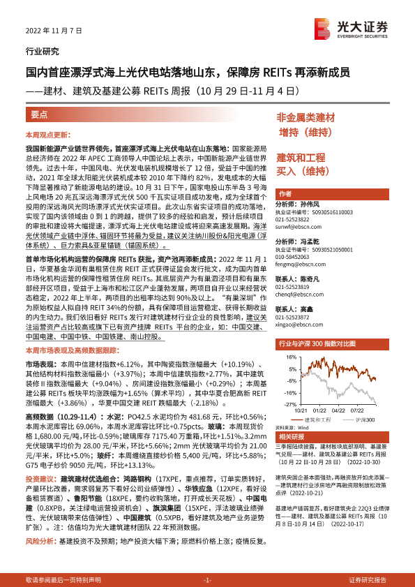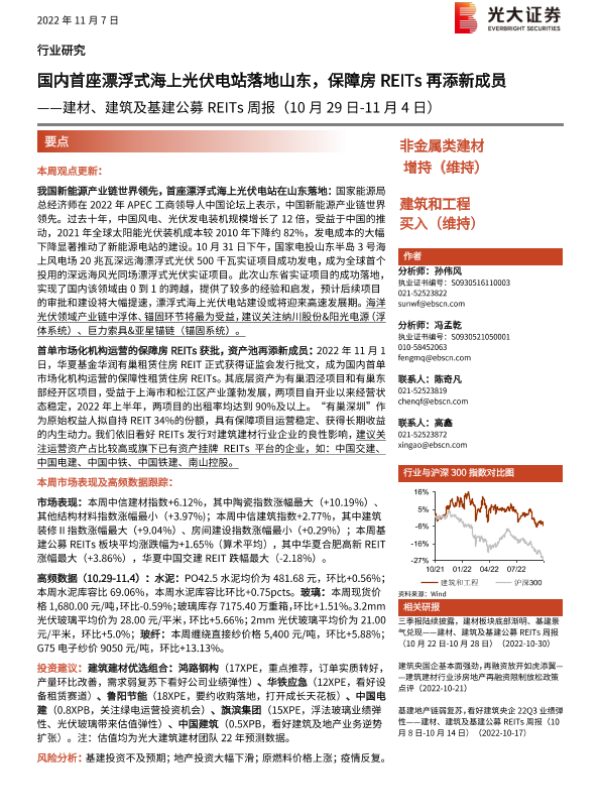 【光大证券】【20221107】光大证券-非金属类建材&建筑和工程行业建材、建筑及基建公募REITs周报:国内首座漂浮式海上光伏电站落地山东,保障房REITs再添新成员-19页