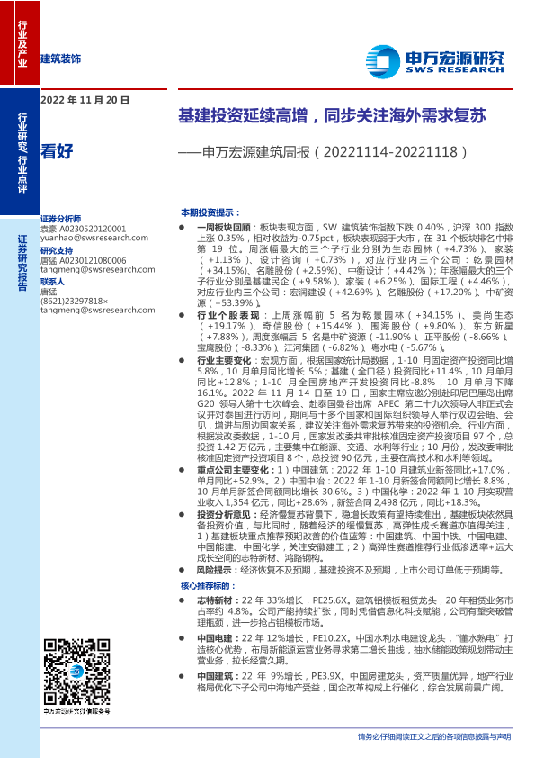 【申万宏源】【20221120】20221120-申万宏源-建筑行业周报:基建投资延续高增,同步关注海外需求复苏-10页