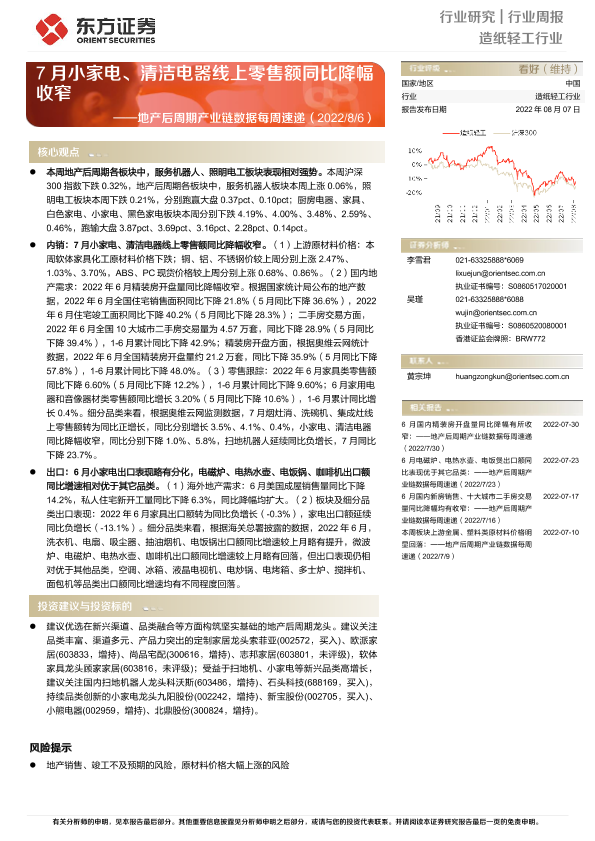 【东方证券】【20220807】20220807-东方证券-造纸轻工行业地产后周期产业链数据每周速递:7月小家电、清洁电器线上零售额同比降幅收窄-14页