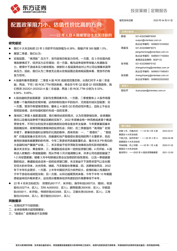 【东方证券】【20220401】22年4月A股展望及十大关注标的:配置政策阻力小、估值性价比高的方向-11页
