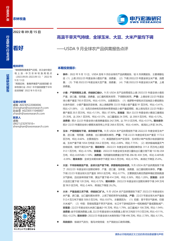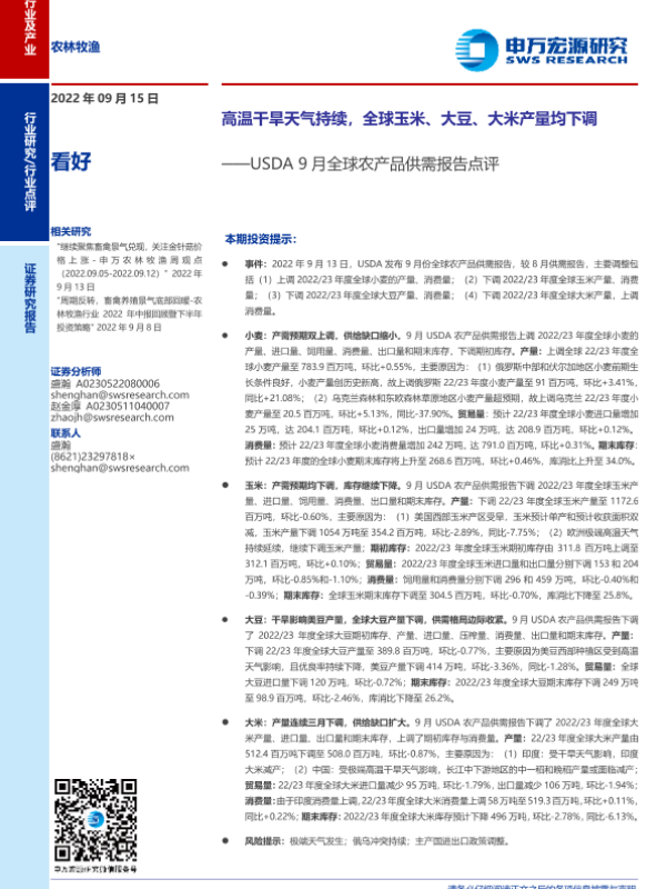 【申万宏源】【20220915】20220915-申万宏源-农林牧渔行业USDA9月全球农产品供需报告点评:高温干旱天气持续,全球玉米、大豆、大米产量均下调-15页
