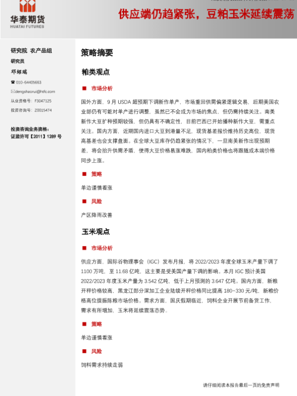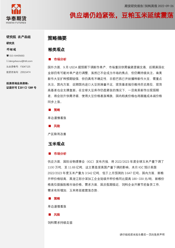【华泰期货】【20220926】20220926-华泰期货-饲料周报:供应端仍趋紧张,豆粕玉米延续震荡-6页