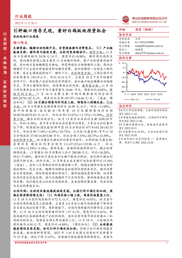 【东亚前海证券】【20221120】20221120-东亚前海证券-农林牧渔行业周报:引种缺口传导兑现,看好白鸡板块投资机会-18页