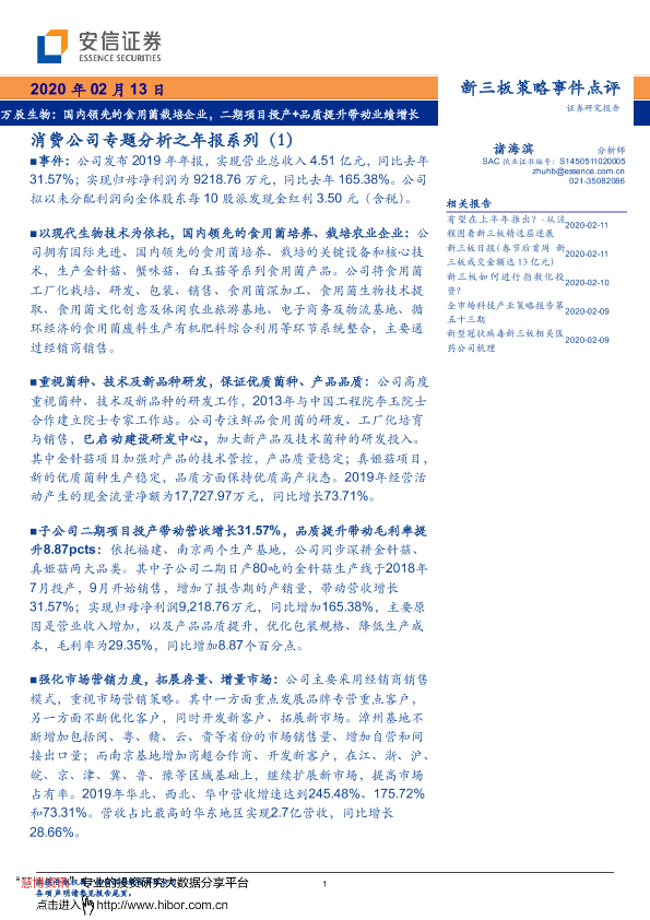 【安信证券】【20200213】消费公司专题分析之年报系列(1):国内领先的食用菌栽培企业,二期项目投产+品质提升带动业绩增长-4页