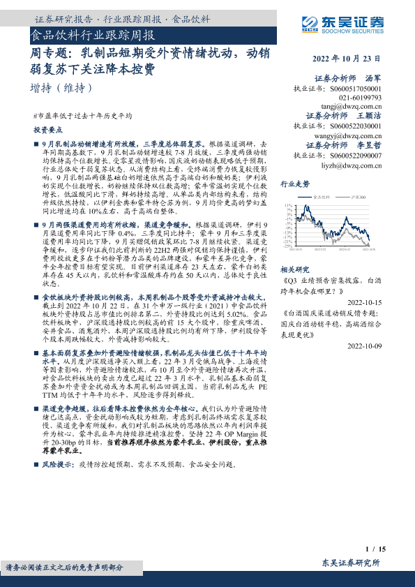 【东吴证券】【20221023】20221023-东吴证券-食品饮料行业跟踪周专题:乳制品短期受外资情绪扰动,动销弱复苏下关注降本控费-15页
