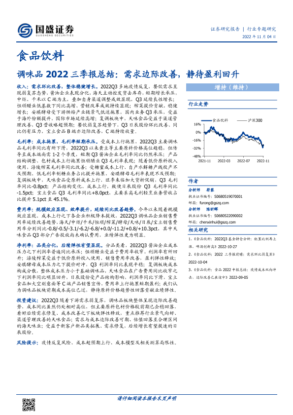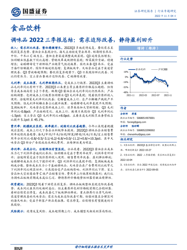 【国盛证券】【20221104】食品饮料行业专题研究:调味品2022三季报总结,需求边际改善,静待盈利回升-10页