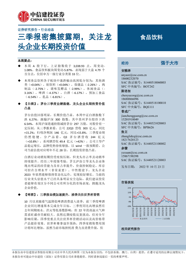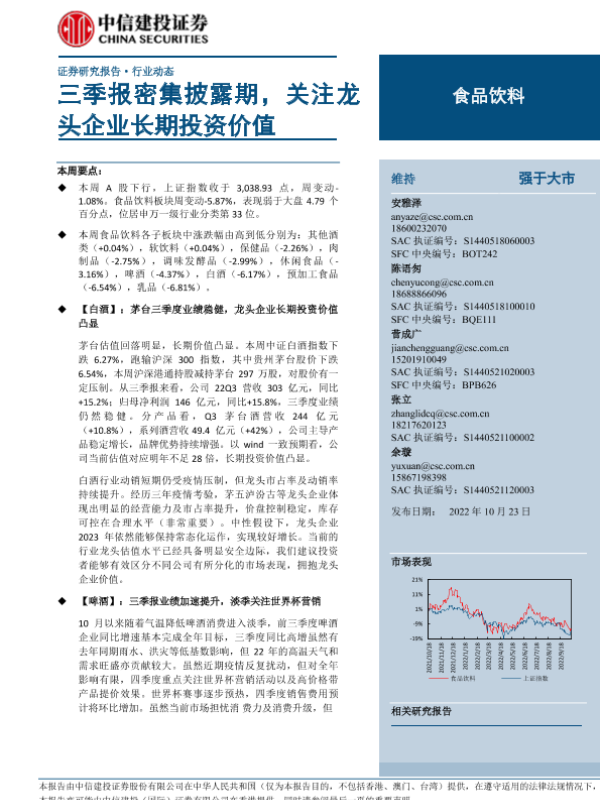 【中信建投证券】【20221023】20221023-中信建投-食品饮料行业动态:三季报密集披露期,关注龙头企业长期投资价值-26页