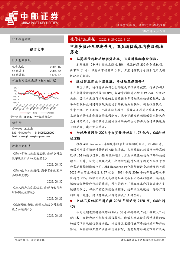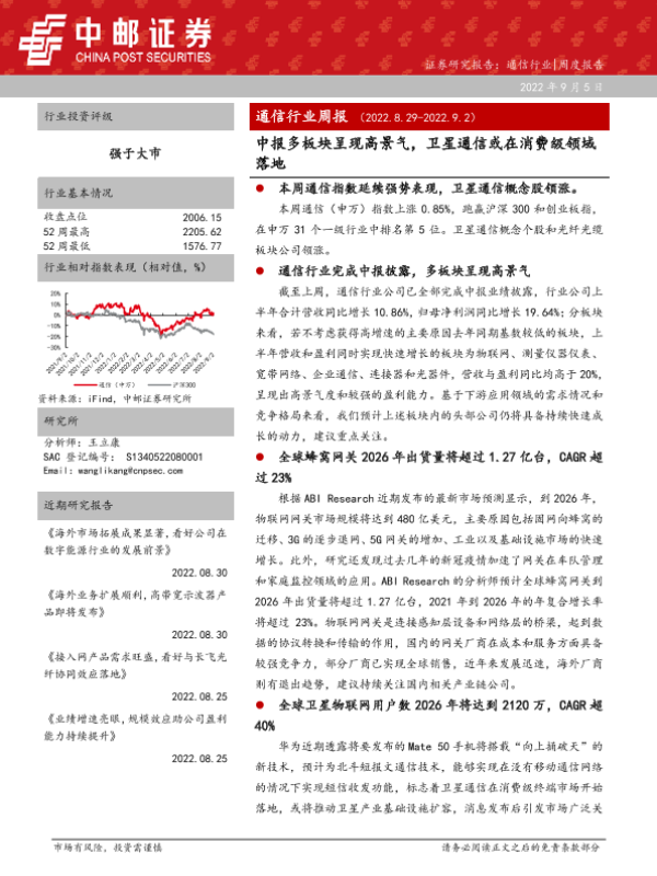 【中邮证券】【20220905】20220905-中邮证券-通信行业周报:中报多板块呈现高景气,卫星通信或在消费级领域落地-25页