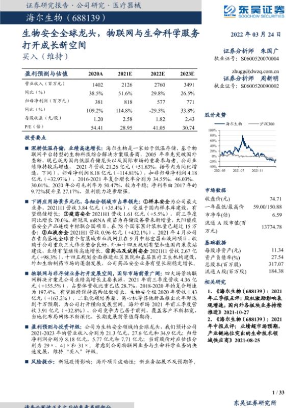 【东吴证券】【20220324】海尔生物-688139-生物安全全球龙头,物联网与生命科学服务打开成长新空间-33页