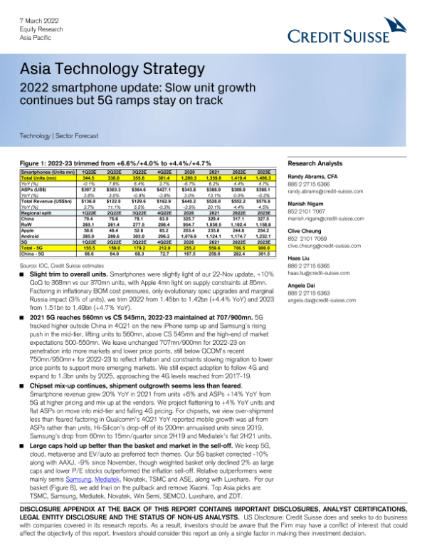 【Credit Suisse】【20220307】瑞信-亚太地区科技行业-2022年智能手机更新:销量继续缓慢增长,但5G的增长势头仍在继续-25页
