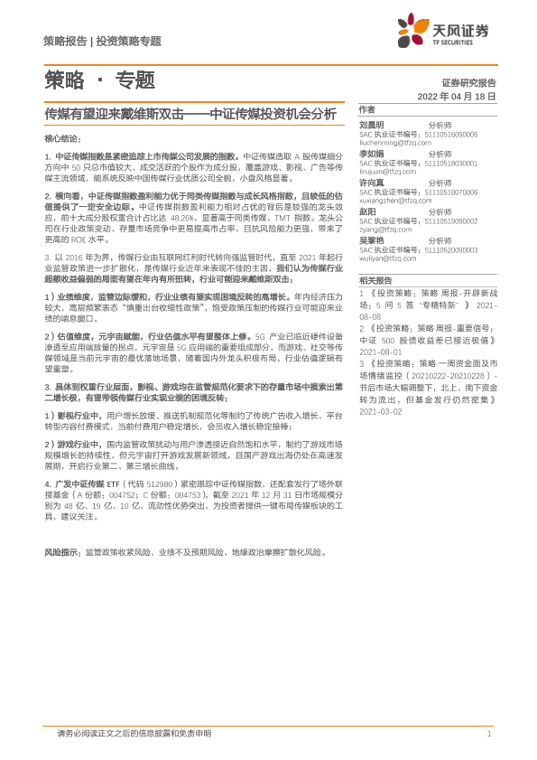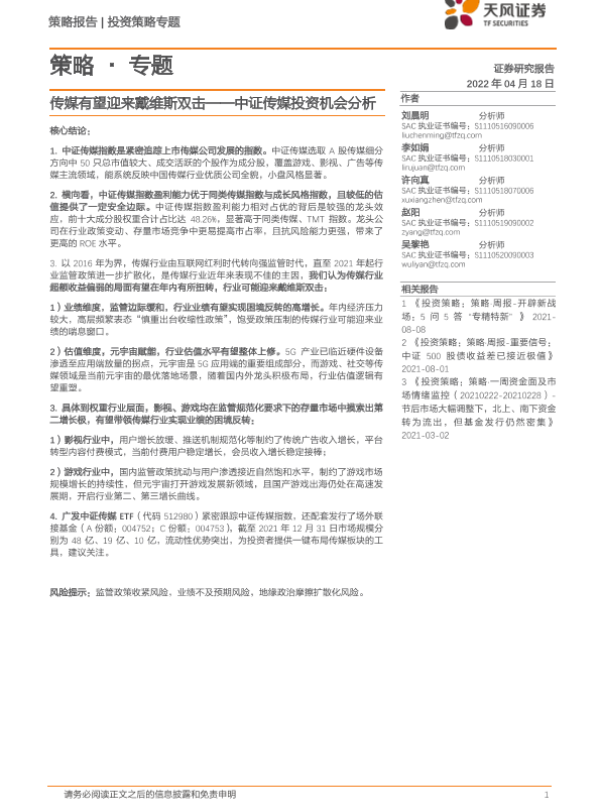 【天风证券】【20220418】策略·专题:传媒有望迎来戴维斯双击——中证传媒投资机会分析-10页