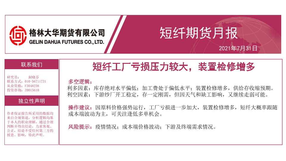 【格林大华期货】【20210731】短纤期货月报:短纤工厂亏损压力较大,装置检修增多-16页