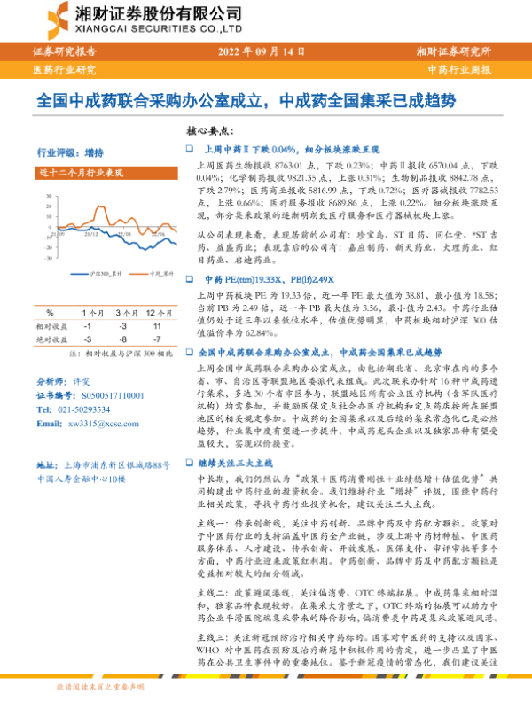 【湘财证券】【20220914】20220914-湘财证券-中药行业周报:全国中成药联合采购办公室成立,中成药全国集采已成趋势-12页