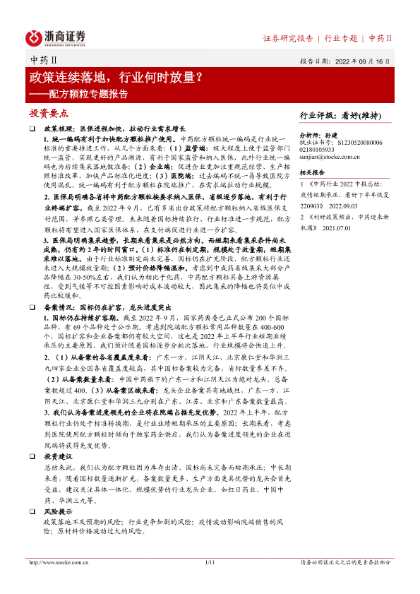 【浙商证券】【20220916】20220916-浙商证券-中药行业配方颗粒专题报告:政策连续落地,行业何时放量?-11页