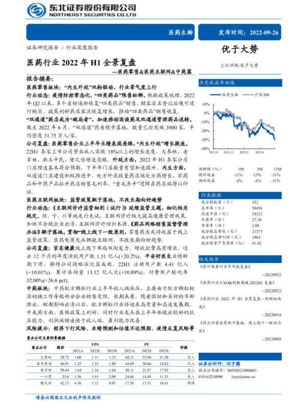 【东北证券】【20220926】医药行业2022年H1全景复盘---医药零售&医药互联网&中药篇-37页