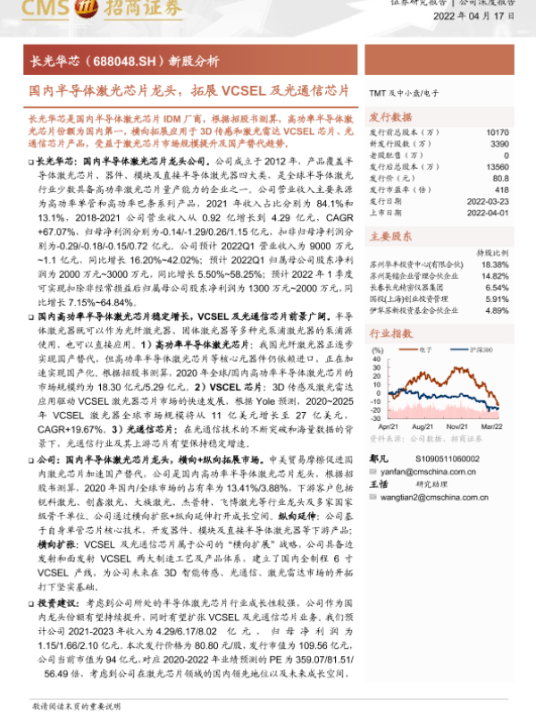 【海通证券】【20220417】长光华芯-688048-新股分析:国内半导体激光芯片龙头,拓展VCSEL及光通信芯片-30页