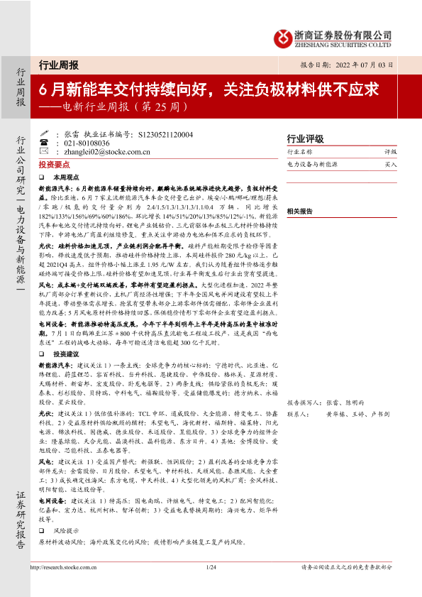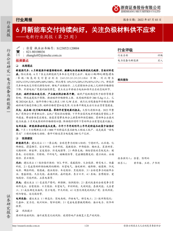 【浙商证券】【20220703】电新行业周报(第25周):6月新能车交付持续向好,关注负极材料供不应求-24页