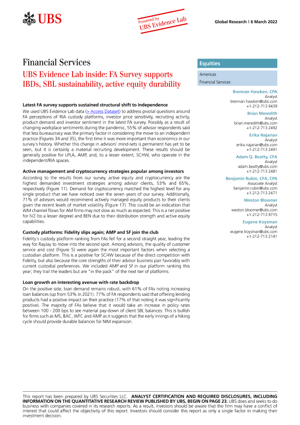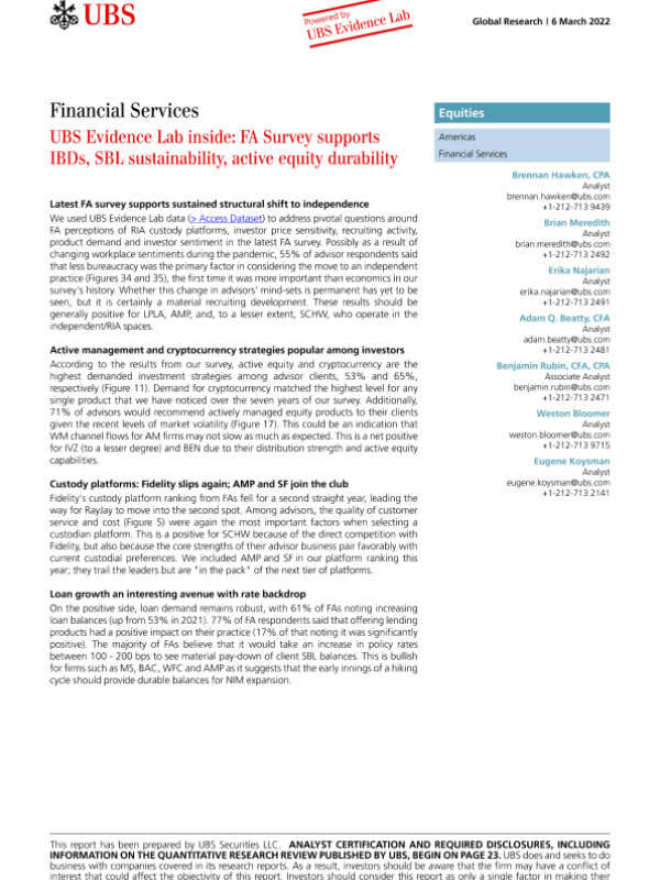 【瑞银】【20220306】瑞银-美股金融服务行业-FA调查支持IBDs, SBL可持续性,活跃股票耐久性-30页