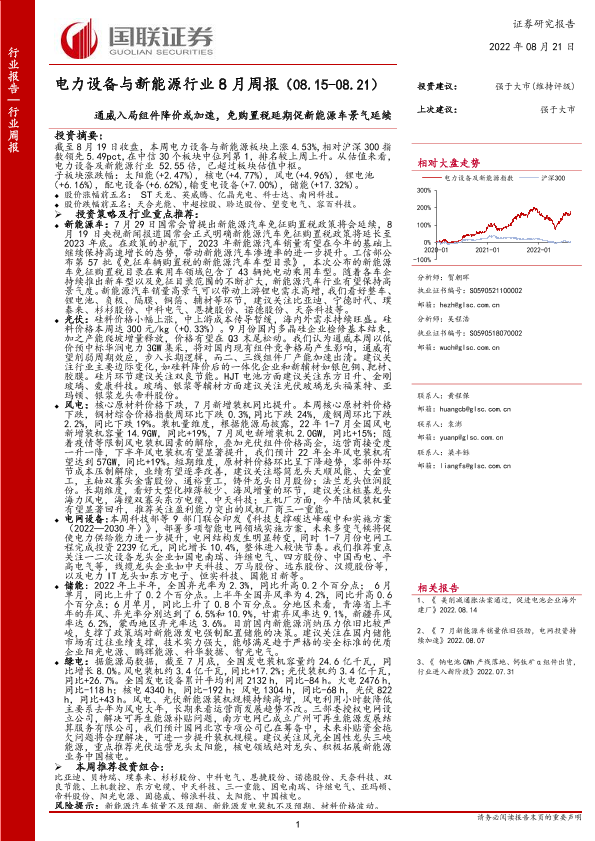 【国联证券】【20220821】电力设备与新能源行业8月周报:通威入局组件降价或加速,免购置税延期促新能源车景气延续-15页