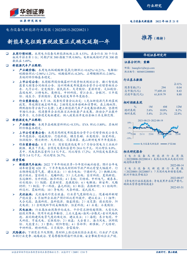 【华创证券】【20220821】电力设备及新能源行业周报:新能车免征购置税政策正式确定延期一年-24页