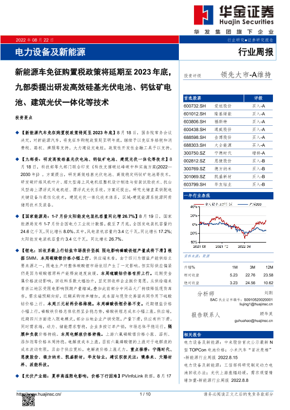 【华金证券】【20220822】电力设备及新能源行业周报:新能源车免征购置税政策将延期至2023年底,九部委提出研发高效硅基光伏电池、钙钛矿电池、建筑光伏一体化等技术-10页