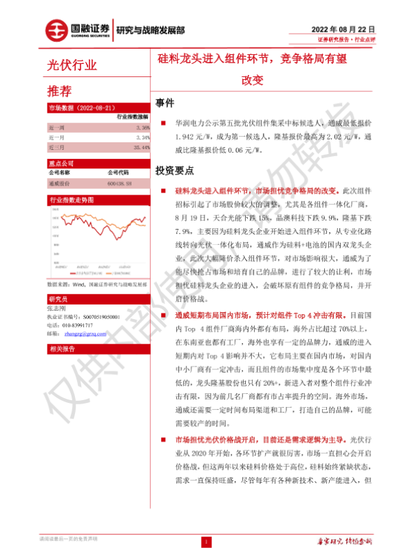 【国融证券】【20220822】光伏行业:硅料龙头进入组件环节,竞争格局有望改变-3页