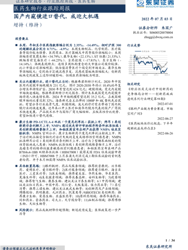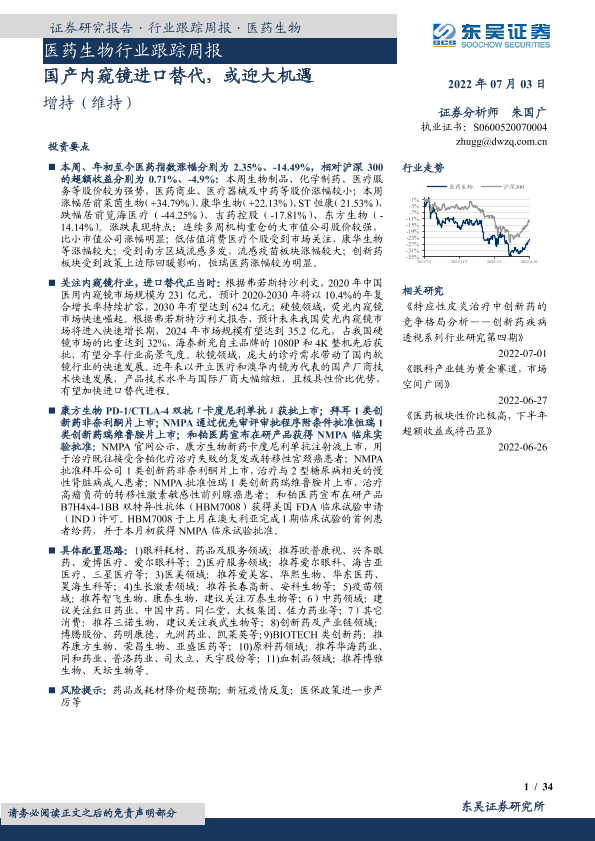 【东吴证券】【20220703】医药生物行业跟踪周报:国产内窥镜进口替代,或迎大机遇-34页