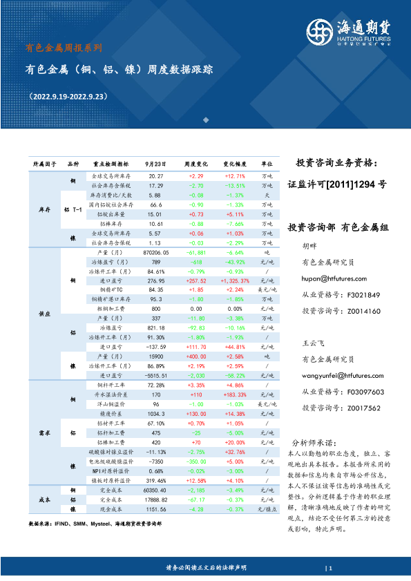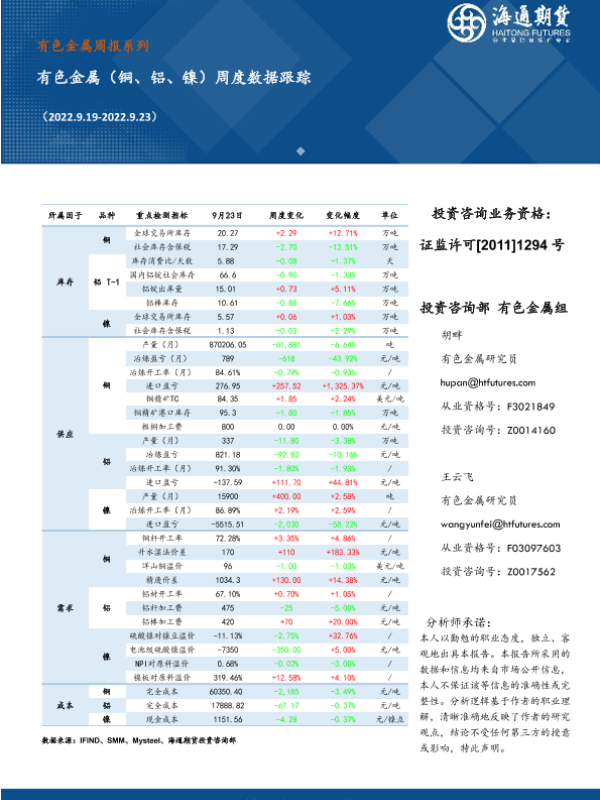 【海通期货】【20220923】有色金属(铜、铝、镍)周度数据跟踪-11页