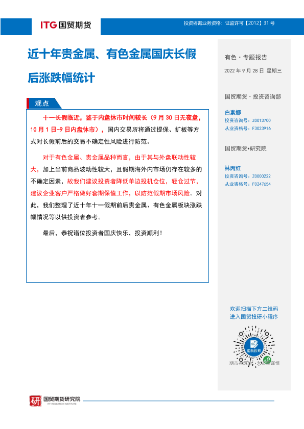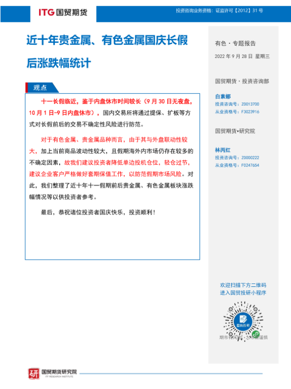 【国贸期货】【20220928】有色·专题报告:近十年贵金属、有色金属国庆长假后涨跌幅统计-7页