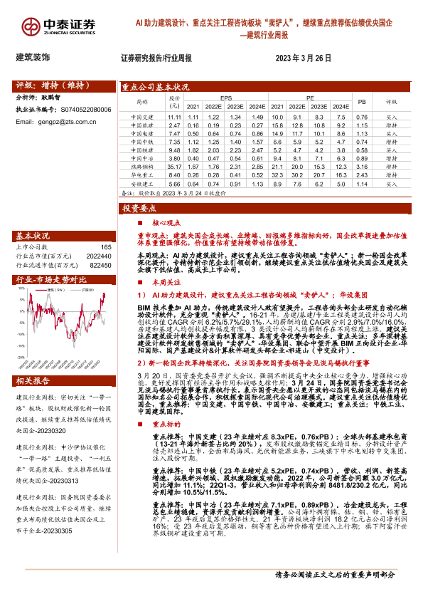 【中泰证券】【20230326】20230326-中泰证券-建筑行业周报:AI助力建筑设计、重点关注工程咨询板块“卖铲人”,继续重点推荐低估绩优央国企-30页