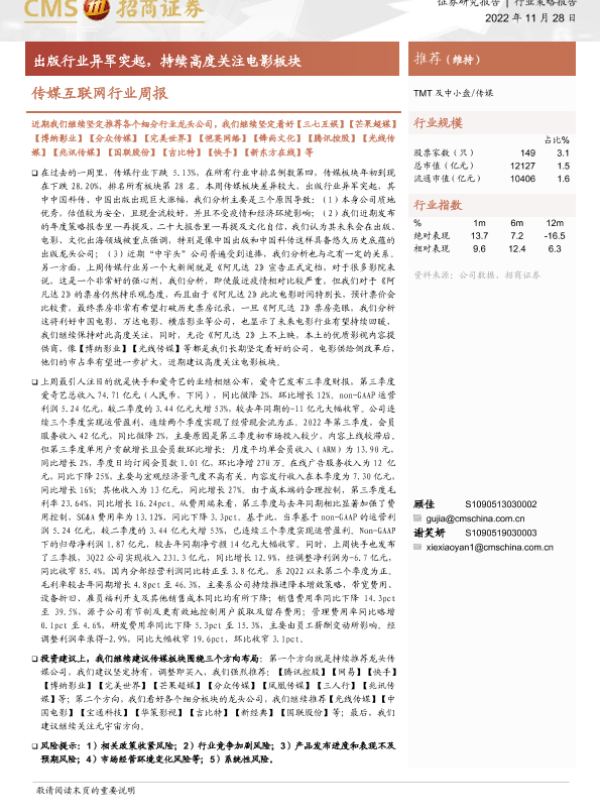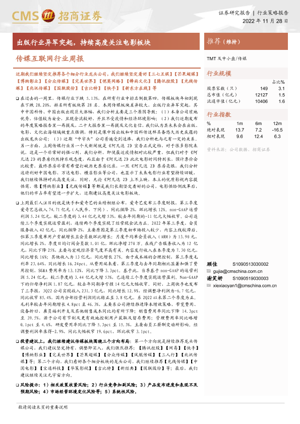 【海通证券】【20221128】20221128-招商证券-传媒互联网行业周报:出版行业异军突起,持续高度关注电影板块-11页