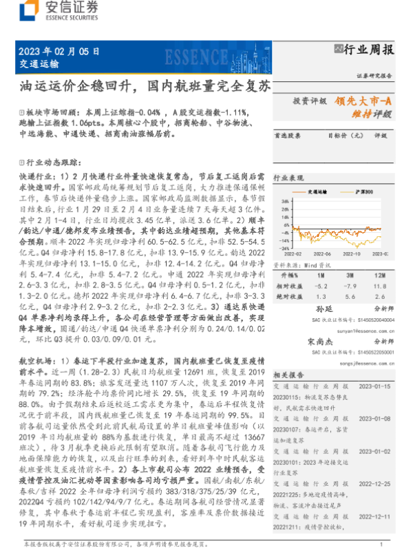 【安信证券】【20230205】20230205-安信证券-交通运输行业周报:油运运价企稳回升,国内航班量完全复苏-23页