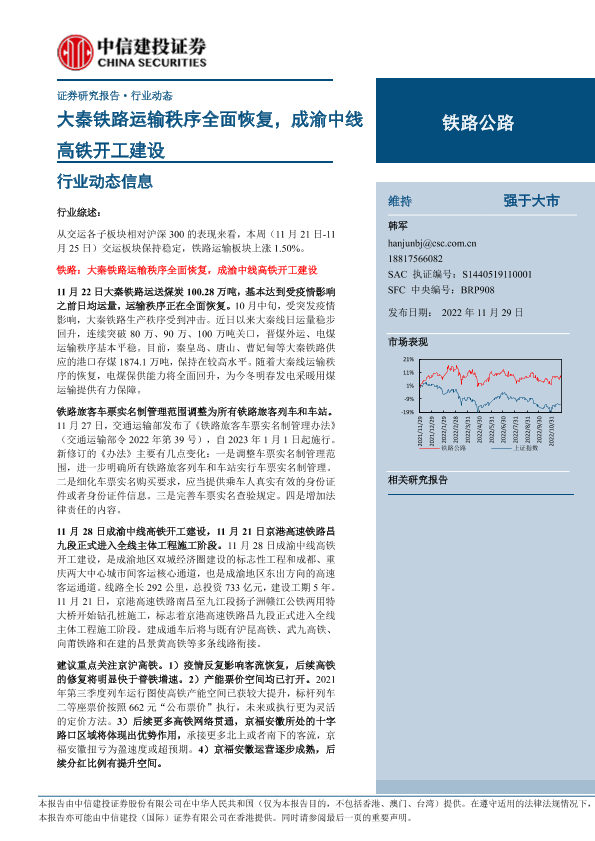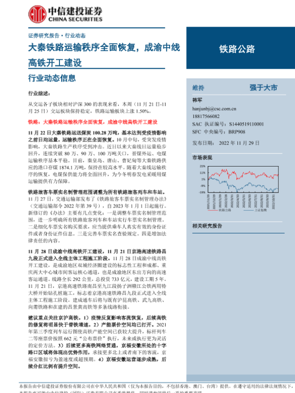 【中信建投证券】【20221129】铁路公路行业:大秦铁路运输秩序全面恢复,成渝中线高铁开工建设-12页