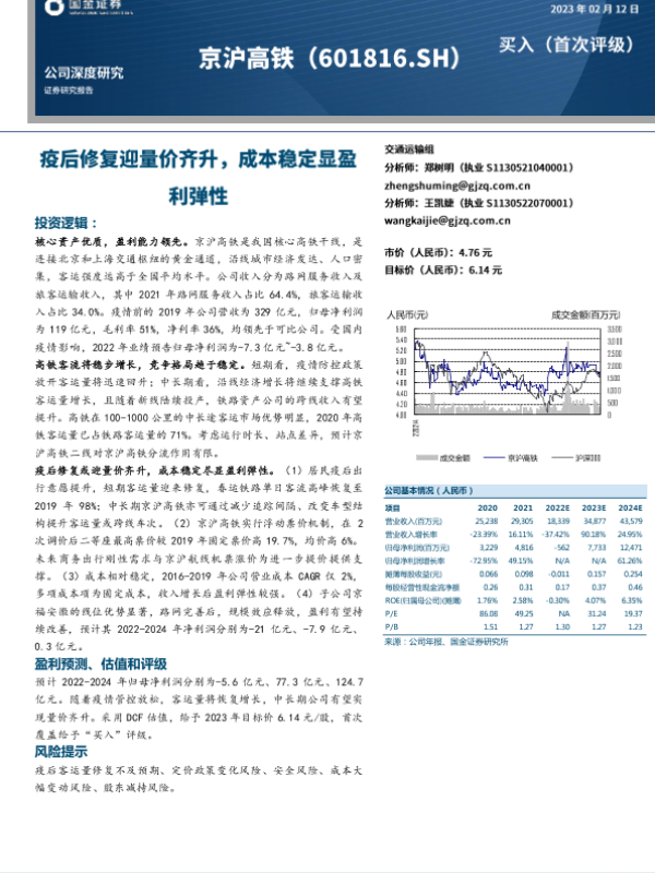【国金证券】【20230212】国金证券-京沪高铁-601816-疫后修复迎量价齐升,成本稳定显盈利弹性-25页