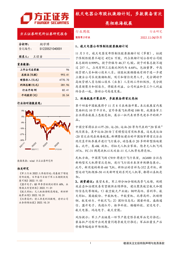 【方正证券】【20221106】国防军工行业周报:航天电器发布股权激励计划,多款装备首次亮相珠海航展-15页