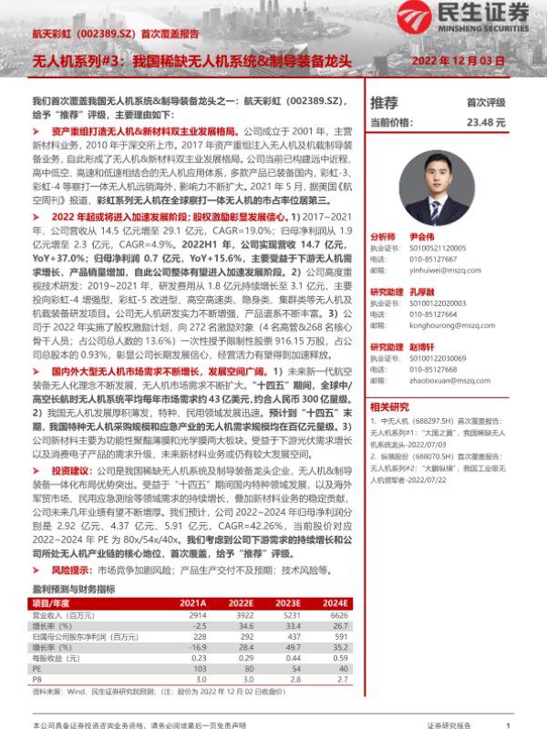 【民生证券】【20221203】20221203-民生证券-航天彩虹-002389-首次覆盖报告:无人机系列3,我国稀缺无人机系统&制导装备龙头-27页