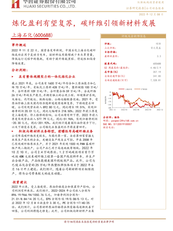 上海石化 新材料 炼化行业 盈利预测 碳纤维