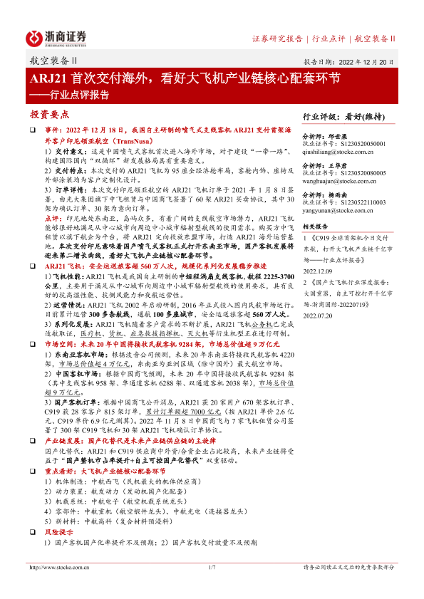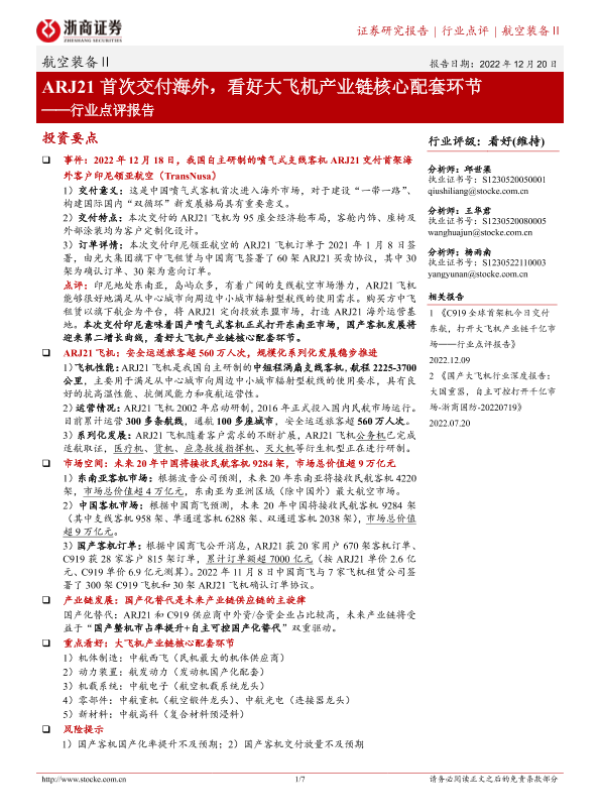 【浙商证券】【20221220】20221220-浙商证券-航空装备行业点评报告:ARJ21首次交付海外,看好大飞机产业链核心配套环节-7页