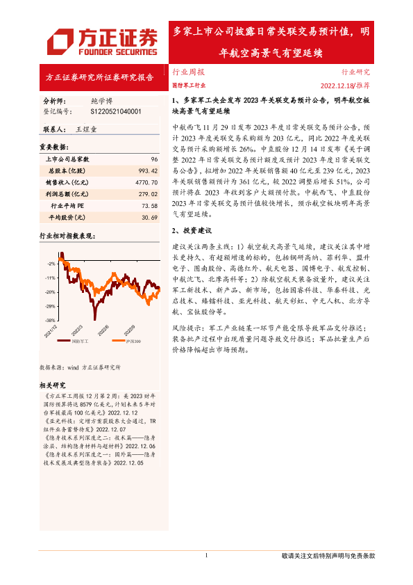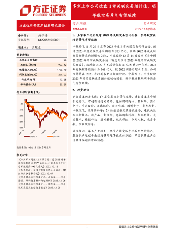 【方正证券】【20221218】国防军工行业周报:多家上市公司披露日常关联交易预计值,明年航空高景气有望延续-13页