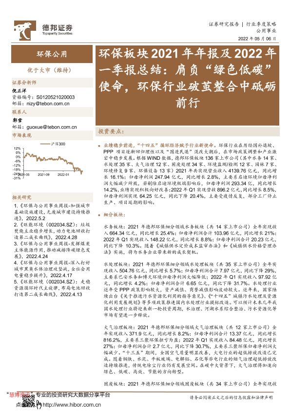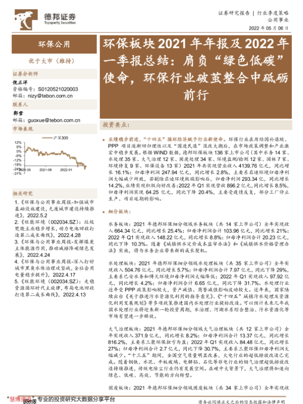 【德邦证券】【20220506】环保行业板块2021年年报及2022年一季报总结:肩负“绿色低碳”使命,环保行业破茧整合中砥砺前行-51页