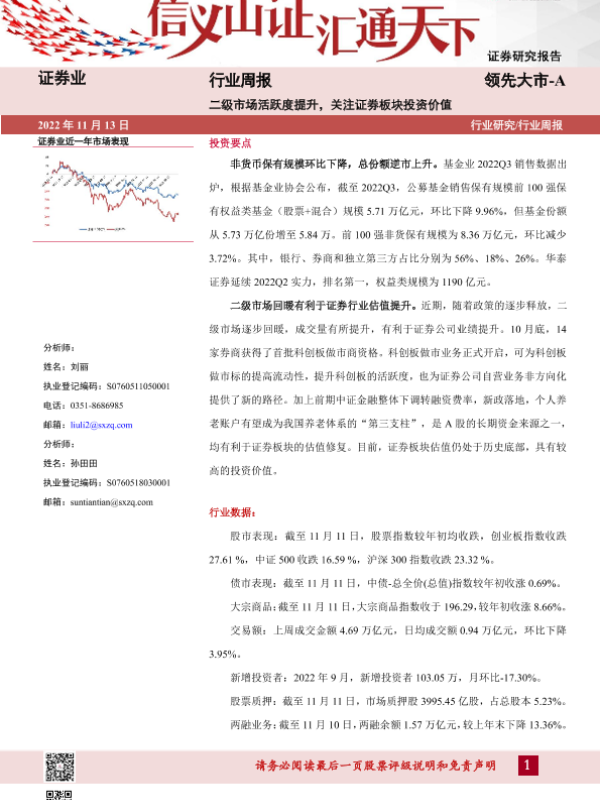 【山西证券】【20221113】证券行业周报:二级市场活跃度提升,关注证券板块投资价值-10页