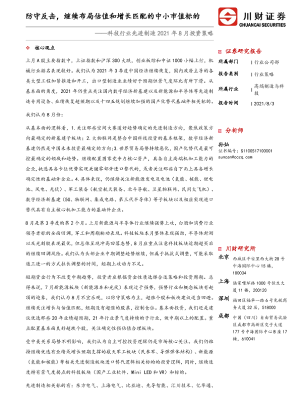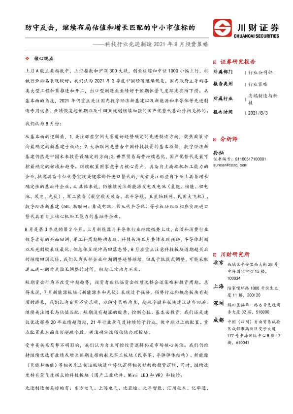 【川财证券】【20210803】科技行业先进制造2021年8月投资策略:防守反击,继续布局估值和增长匹配的中小市值标的-17页