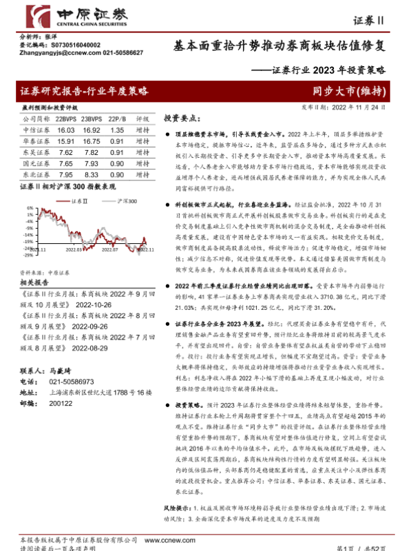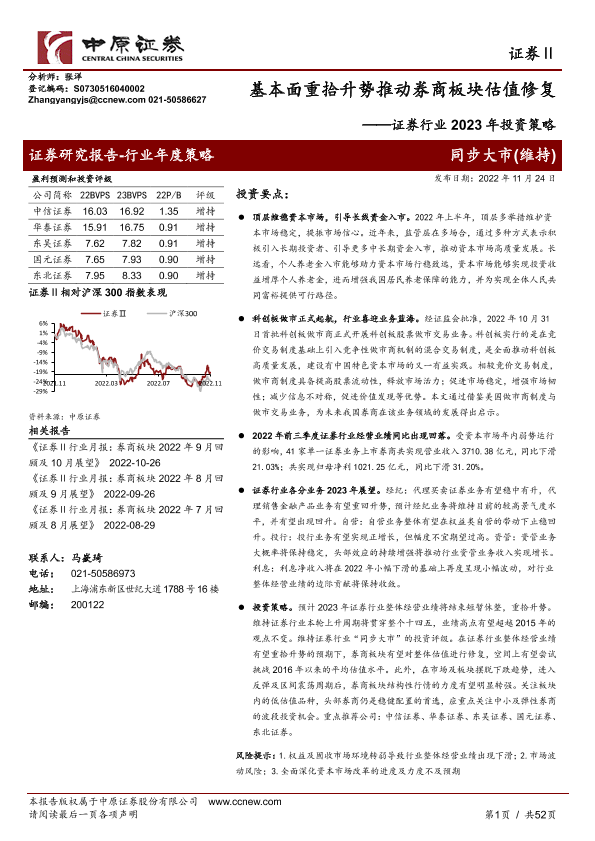 【中原证券】【20221124】证券行业2023年投资策略:基本面重拾升势推动券商板块估值修复-52页