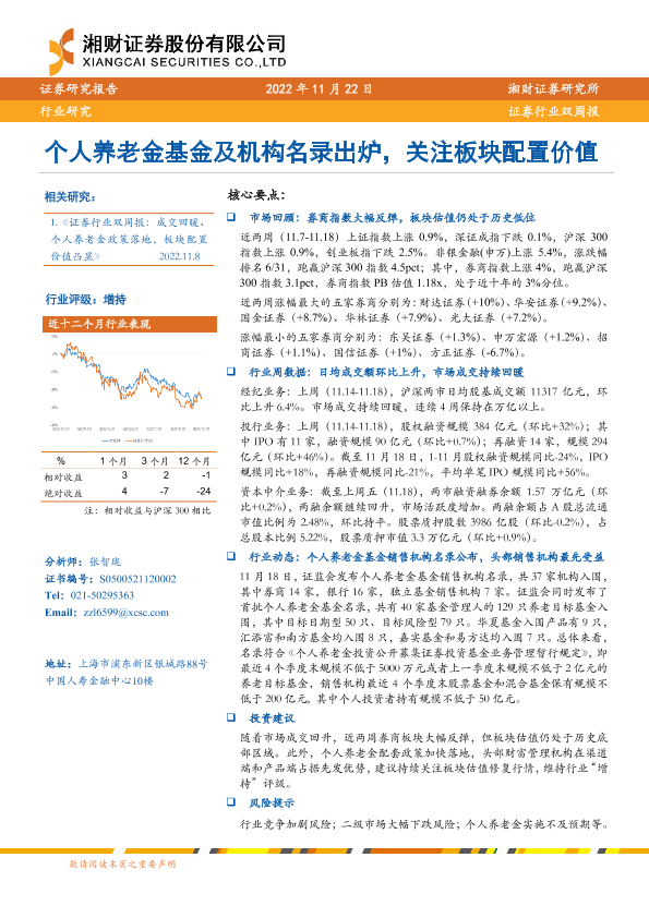 【湘财证券】【20221122】20221122-湘财证券-证券行业双周报:个人养老金基金及机构名录出炉,关注板块配置价值-9页