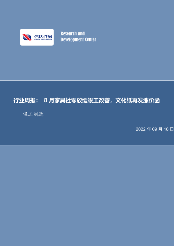 【信达证券】【20220918】20220918-信达证券-轻工制造行业周报:8月家具社零放缓竣工改善,文化纸再发涨价函-20页
