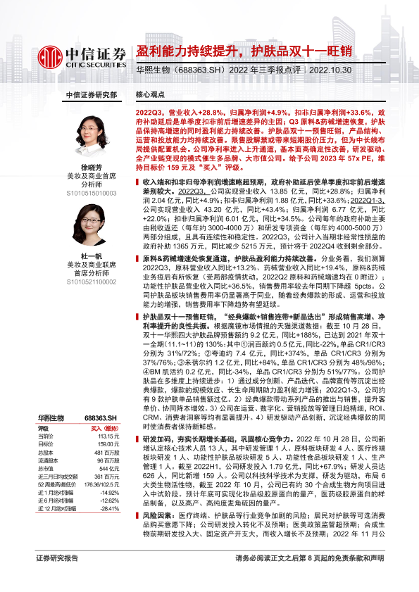 【中信证券】【20221030】2022年三季报点评:盈利能力持续提升,护肤品双十一旺销-9页