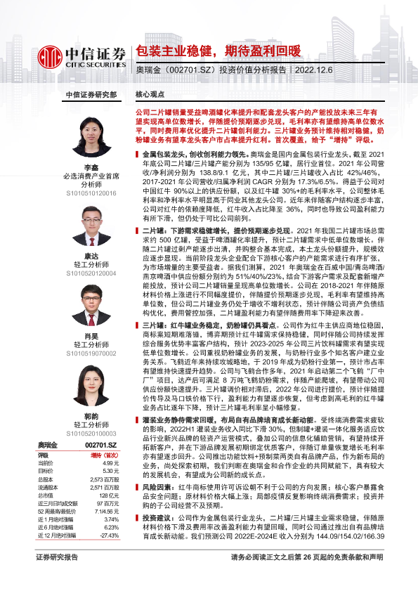 三片罐 二片罐 盈利预测 自有品牌 金属包装