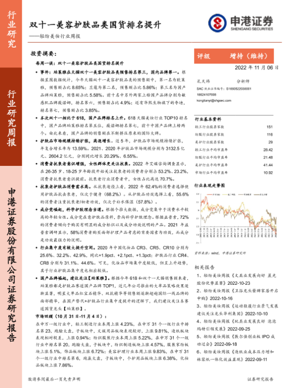 【申港证券】【20221106】20221106-申港证券-轻纺美妆行业周报:双十一美容护肤品类国货排名提升-16页
